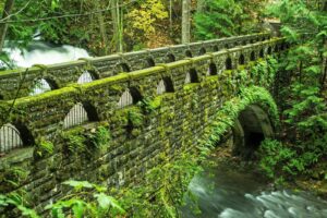 Five and a half miles of forested trails run through a basalt gorge inside the city limits. The main waterfall drops into a deep pool crossed by a stone bridge built by the Civilian Conservation Corps in the 1930s. One to two hours with no admission charge and parking close to the trailhead. A strong option for a mid-morning outing before heading downtown.